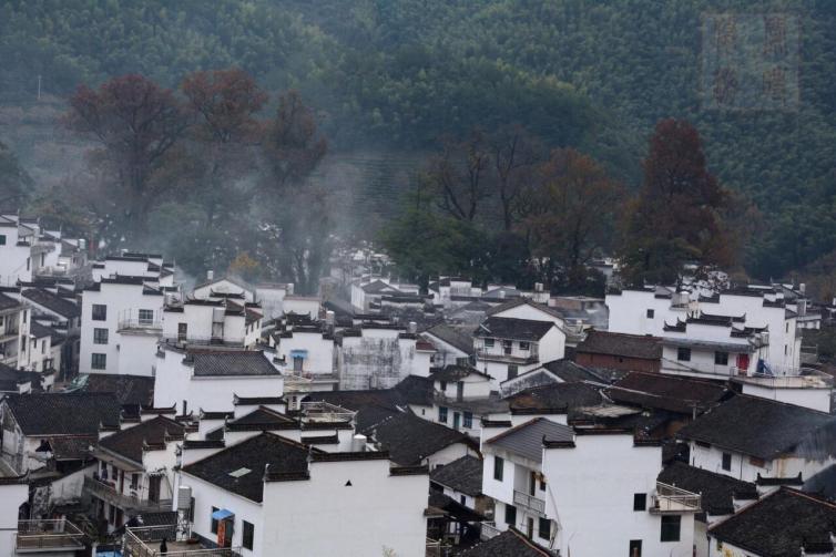 远远望去,白雾,红枫,加上典雅的徽派建筑,便构成了一个如梦似幻的画面。