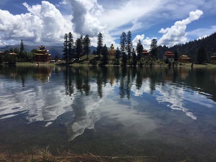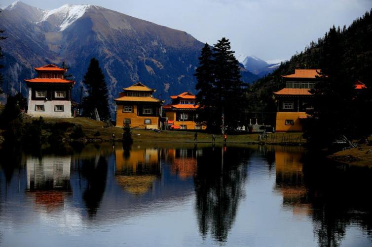都说措卡湖不是很大,可她那碧玉般的湖水晶莹剔透,万花筒般地收集着蓝天、白云、绿树、青山、红寺庙的身影,仿佛整个世界都被她揽入怀里。翻过一个山口,山势便豁然开朗,两边的草地黄中间绿,从山脚直铺至山顶,成群结队的牦牛和山羊隐没其间。