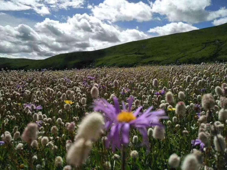 红原县俄木塘草原花海,位于该县壤口乡境内,紧邻省道209线,是一片罕见的鲜花海洋。白天,人们可以安逸地坐在鲜花织成的地毯上,悠闲自在,喃喃细语,空旷辽远的天上变幻着不同层次的蓝色,是自然调制的色彩,浅蓝、深蓝、湛蓝……