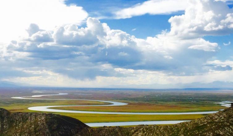 巴音布鲁克草原的美除了如茵如盖的牧草和缤纷绚丽的各色野花之外,更在于一条名叫“开都”的河流。从远处看,它就像一条几十米宽的玉带蜿蜒穿梭于辽阔的平原上,一直通向天尽头。这其中,最精华、最点睛的一笔则要数“九曲十八弯”了。