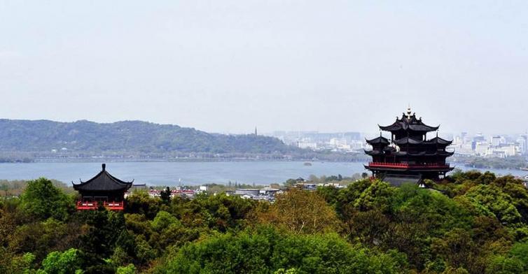 我们沿着小路继续往上走,走到了江湖汇观亭,它是紫阳山最高处。我们沿着旋梯上楼,向东眺望,看到了高楼大厦,从西边看能看到美丽的西湖。