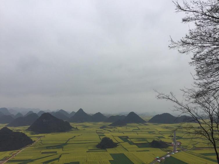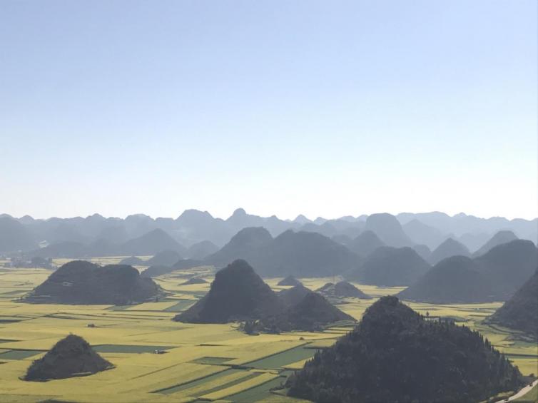 如今,罗平80万亩油菜花竟相怒放、金浪翻滚,片片块块、高低起伏、蝶舞蜂飞,清香泌人,有迂回曲折、有螺旋泻落,与远山近水,村落人家相辉映。登上金鸡峰丛,油菜花漫山遍野铺天盖地,秀峰、村舍、道路、河流,皆融汇入油菜花海,近处村落点点,远处孤山耸立,蔚为壮观。