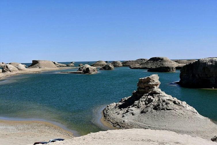 分东西两湖,以前是一个湖,因为湖水退缩形成了两个湖泊,这里是中国唯一一处水上雅丹,鲜绿的湖水,配上土丘,有的像排列整齐的战舰,即将出海,有的像千万条鲸鱼等,令人充满遐想。