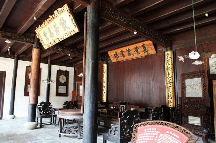 这个由“四象”之首刘镛的孙子所建的藏书楼,鼎盛时藏书有6万卷,共约16万册,总体也是中西合璧的建筑。藏书楼是一座回廊式的两层楼房,共五十二间。站在大天井中东南西北四望,只见凡朝天井的库房均安装的是落地长窗,窗多,便于