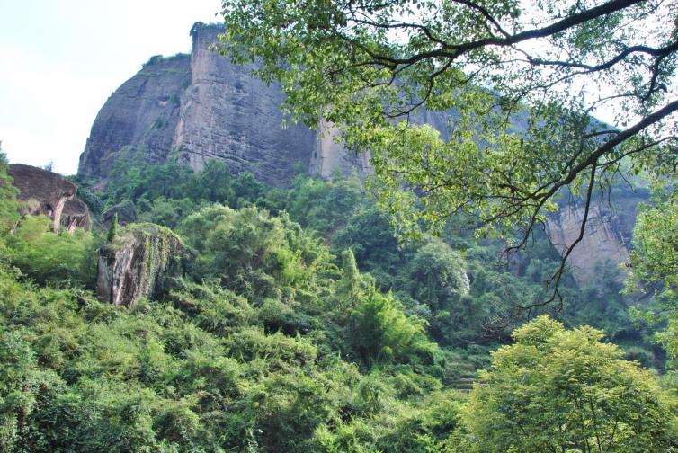 大王峰是进入武夷山的第一峰。峰顶古木参天,南壁悬崖峭壁,只有南壁一条狭小的孔道,可供登临峰巅。这是一条直上直下的裂罅,裂罅越高越窄,有的地方登临者需侧身缩腹,手足并用而过。从观左拾级而上,就是通天台。再往上攀几步,便到了大王峰顶。