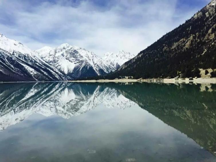 然乌湖,周围连绵的雪山和不时飞过的水鸟倒映在清澈的湖水中,景色美极了。