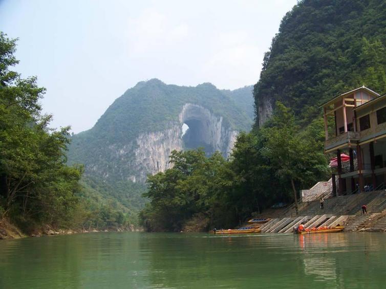 位于紫云县的格凸河风景区几乎囊括了喀斯特地貌的所有特征,既有绝壁上的巨型洞穴“大穿洞”和“穿上洞”,也有河水在地下蜿蜒穿梭形成的神秘奇景。游客在见证“蜘蛛侠”徒手攀岩的同时,还可等待“天地神光”的奇景。