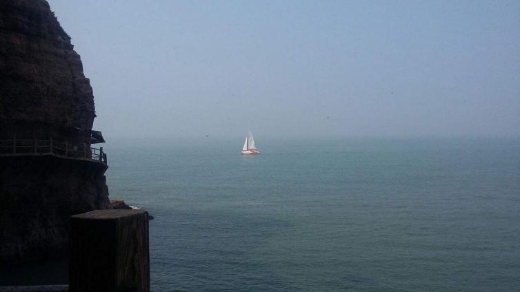 这里是被称为胶东一绝的田横栈道。栈道全长220米,高2米,离崖壁地面20米,东起回仙洞,西抵老虎洞。