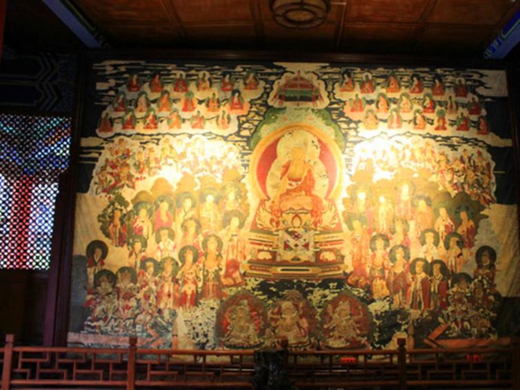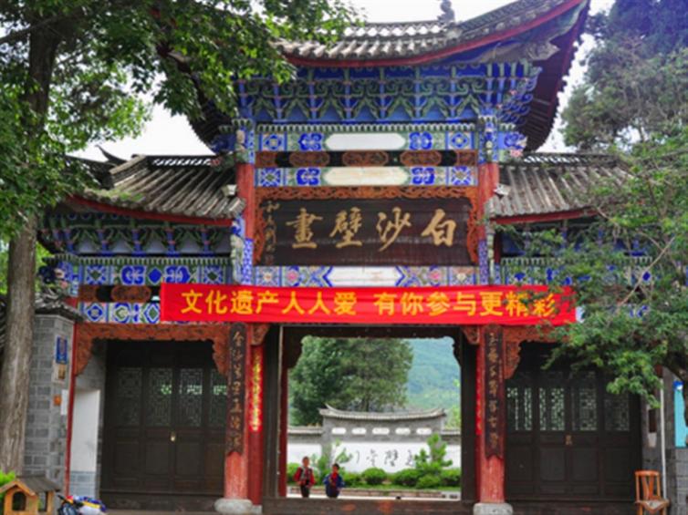 大宝积宫,位于丽江城北8公里处的白沙街。琉璃殿坐西向东,建于明代永乐十五年(1417年)。为重檐歇山顶,面阔两间,呈方形。柱梁粗实,斗拱雄健,宽敞壮观,金柱内上檐斗拱下残存壁画16幅,画作于明永乐年间至清末,早期作品朴实,晚期作品线条粗犷。其中最享盛名的白沙壁画——《如来讲经传教图》,壁画展示了藏传佛教、汉传佛教、道教等宗教活动和故事,画面中有大小100多个人物画像,线条精细,色彩艳丽,突出特点是多种宗教内容合一,多民族传统绘画技巧与风格交融,可以说是稀世奇珍。