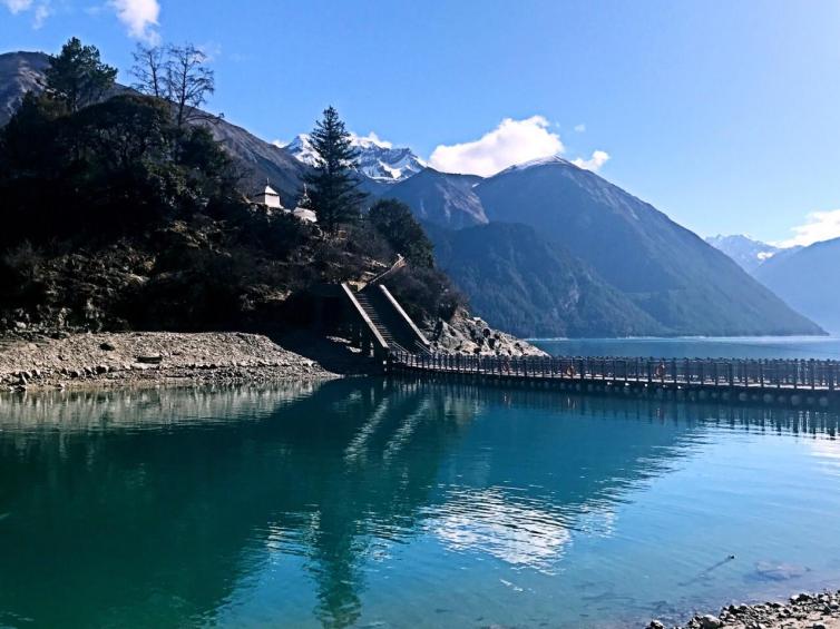 确实如它的名字般,巴松措是绿色的,是那种淡淡的玉石般没有杂质的绿色,湖水清澈得可以看见两三米下成群游动的鱼儿,四周青山如黛,顶峰是终年不化的积雪。