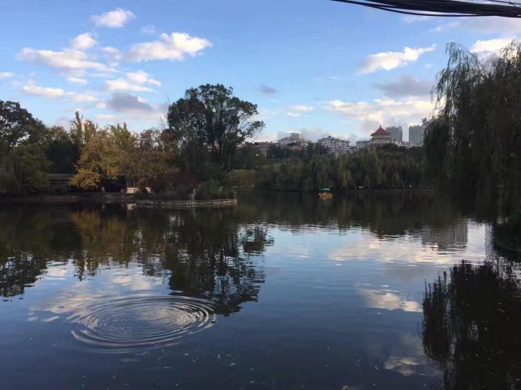 2、翠湖公园。云南大学正门对面,湖中鸟类多,买袋鸟食,边喂食,边感受初到云南时的阳光、绿树、蓝天、白云。