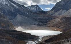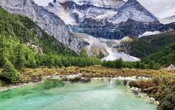 牛奶海,又叫俄绒措,古冰川湖,状如水滴,四周雪山环绕。 牛奶海位于央迈勇山脚下,是一个古冰川湖,面积0.5公顷,海拔4500米,四周雪山环绕,湖水清莹碧蓝,山上成瀑,以其玲珑秀雅水色翠蓝而著名,牛奶海上方有大片的冰川。传说每年春暖花开之时,湖水会像牛奶一样洁白如琼浆,并因此得名牛奶海。湖水清莹碧蓝,山止成瀑,以其玲珑秀雅水色翠蓝而著名。 近岸边的水略有些黑色,下面都是远久植物的沉积,往里面是浅绿色的一带,再深处便是碧蓝色的水面,蓝得透亮。