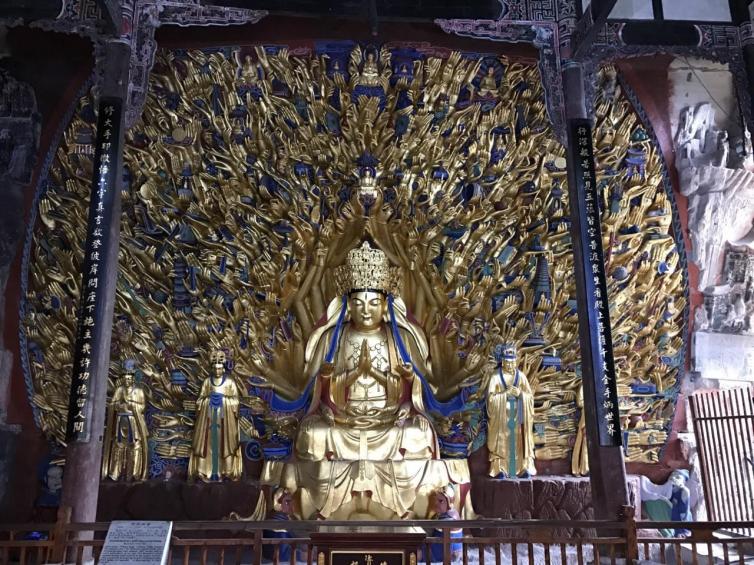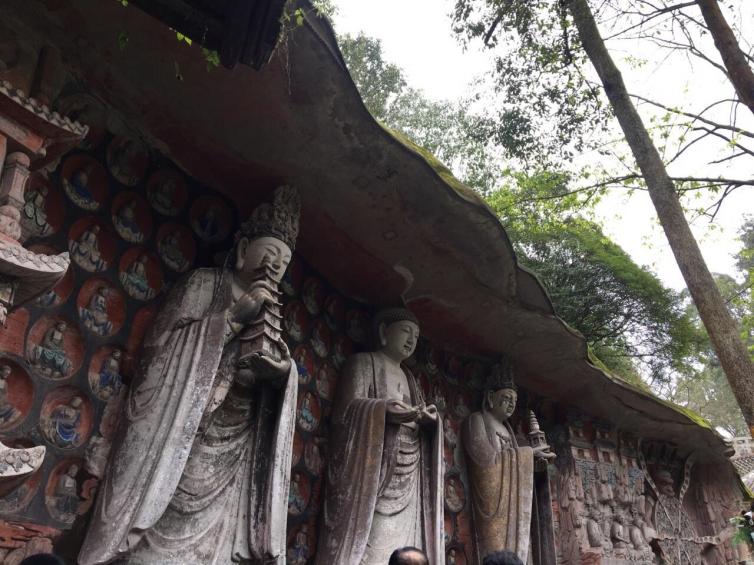 大足石刻是唐末、宋初时期宗教摩崖石刻,石刻群有75处,5万余尊宗教石刻造像,以佛教题材为主,儒、道教造像并陈,是中国晚期石窟造像艺术的典范。