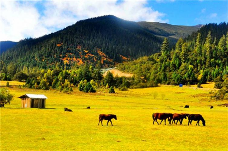 鲁朗林海位于距林芝地区八一镇80公里左右的川藏公路上。这是一片典型高原山地草甸狭长地带,两侧青山由低往高分别由灌木丛和茂密的云杉、松树组成鲁朗林海。中间是整齐划一的草甸。草甸中,溪流蜿蜒,成千上万种野花竞相开放。木篱笆、木板屋和农牧民的村落星罗棋布,山间的云雾时聚时散,雪山、林海、田园勾画了一幅恬静、优美的“山居图”