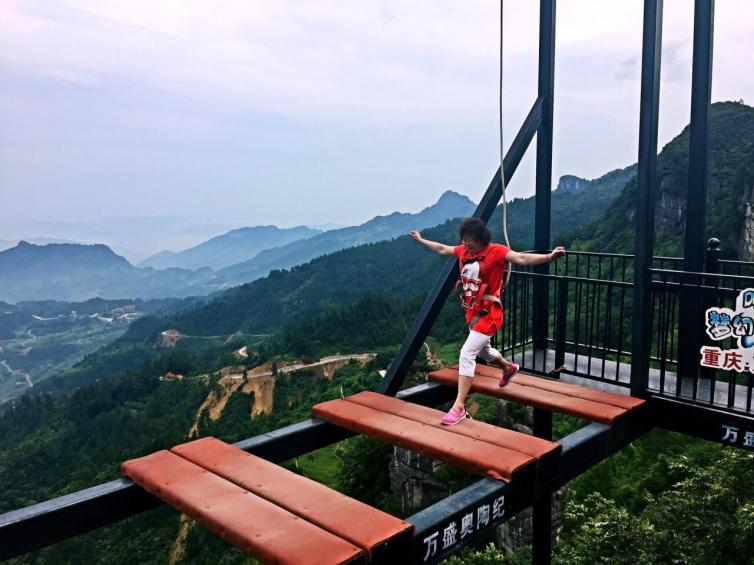 玻璃吊桥,它跟张家界的玻璃桥一样悬挂在300米高空,但因为不是水平垂直于地面,摇摇欲坠的感觉让人无时无刻不想念地心引力。这里我要给大家提个醒,此处风大,而且桥面为玻璃材质,所以极易走光,不适合穿裙子游览。