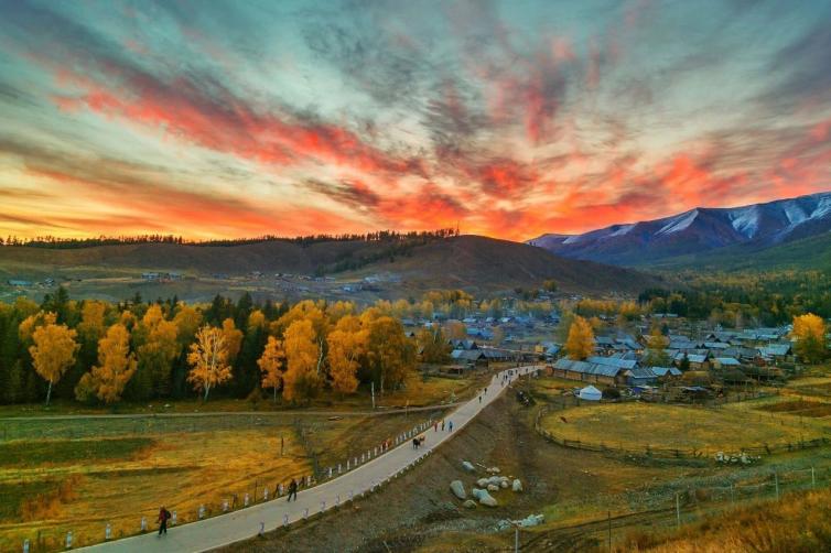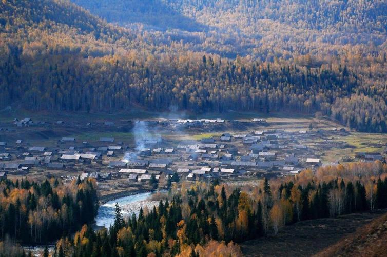 位于北疆阿勒泰地区布尔津县,喀纳斯湖东侧约30公里处,是一个由哈萨克人和图瓦人共同聚居的小村庄,充满原始味道。万山红遍的醉人秋色,炊烟在秋色中冉冉升起,形成一条梦幻般的烟雾带,胜似仙境。
