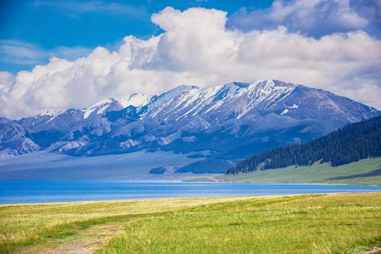 赛里木湖背靠雪山,终年不化,银装素裹。湖水碧蓝,湖边是广阔草原,牧马奔驰,牛驼踱步,静谧、温馨、粗犷深远、如诗如画……