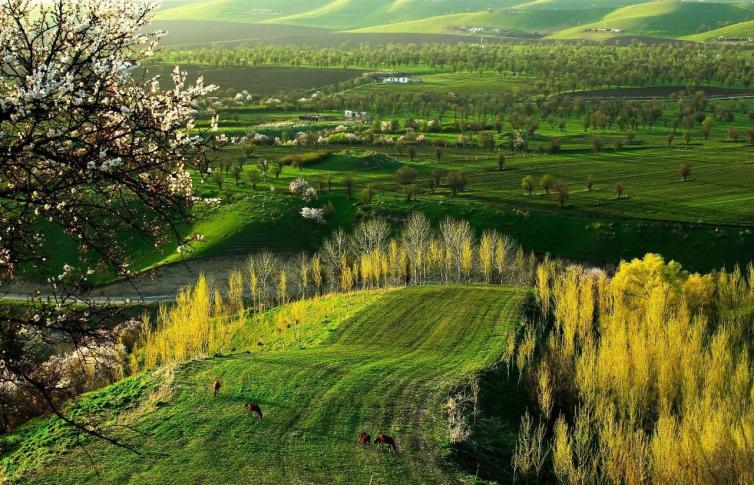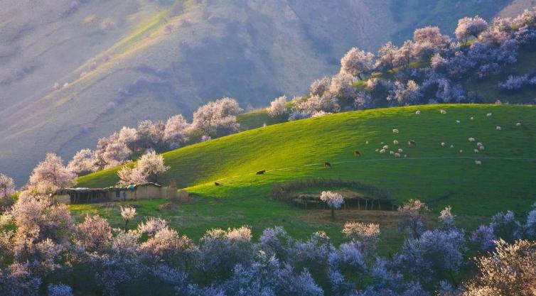 位于伊犁河谷阿吾拉勒山南麓的杏花沟,气候湿润,水汽充沛。三万多亩原始野生杏树林,花开时节,如同童话世界。
