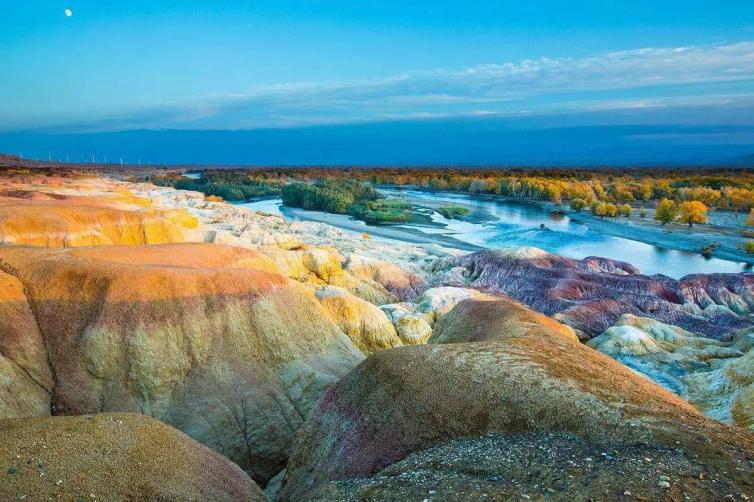 位于新疆布尔津县城西北24公里处的额尔齐斯河北岸,是一个以雅丹地貌著称的河滩。地下侏罗纪时代的煤层,经过千万年风蚀雨剥以及河水的冲刷,在几乎寸草不生的河滩上出现了红、绿、紫、黄、棕等鲜艳的色彩。
