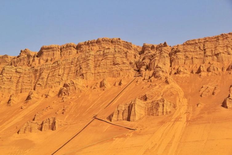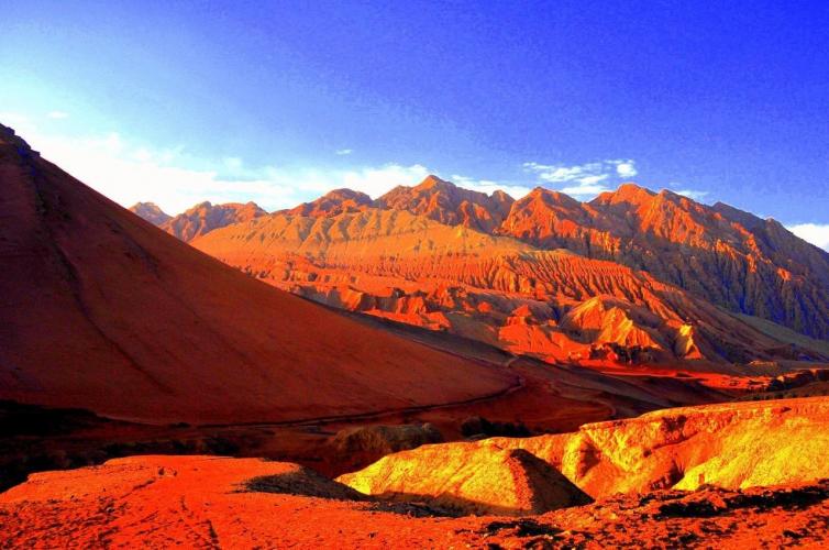 维吾尔语称“克孜尔塔格”,意为“红山”。火焰山重山秃岭,寸草不生。每当盛夏,红日当空,地气蒸腾,焰云燎绕,形如飞腾的火龙十分壮观。