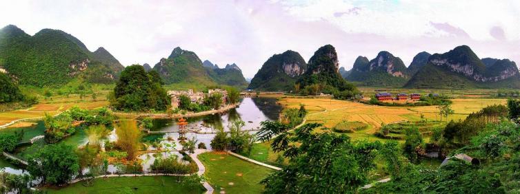 位于大新县堪圩乡明仕村的田园风景山清水秀,山环水绕,素有小桂林之称。这里翠竹绕岸,农舍装点,阳关道横,稻穗摇曳,农夫荷锄,牧童戏水,风景俊朗清逸,极富北国田园气味。