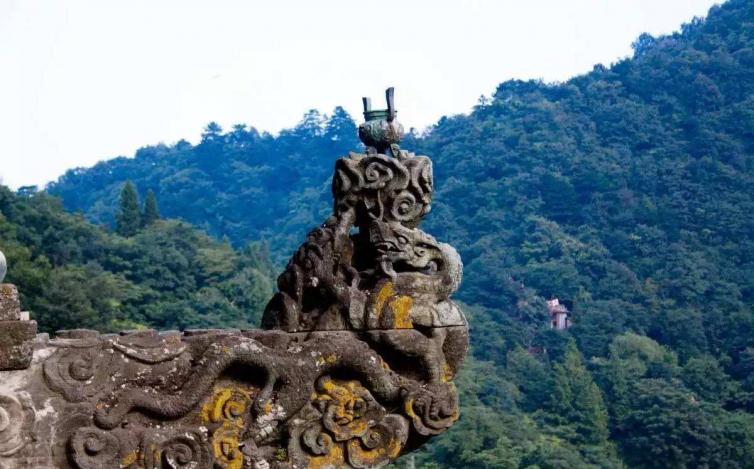 山顶有一小庙,设于一处突出的石崖最外端,庙旁立五色令旗,庙中所供之香称为龙头香。石梁最窄段几无下足之处,两边就是深不见底的悬崖,但只要游客愿意出钱请香,哪怕风吹雨淋,道士都会手持香火,身上不戴任何防护,替你走过这道石梁去烧一柱龙头香,其惊险令人称奇。雨中,插完龙头香的道士正沿石梁返回。