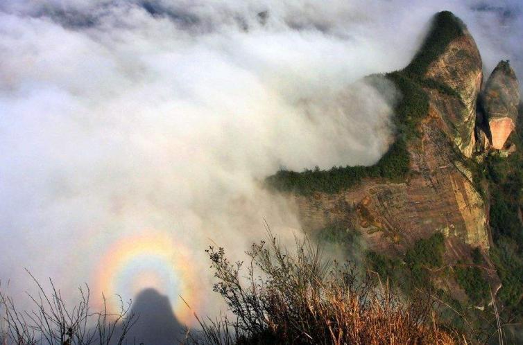 受风雨蚀化程度不对称的影响,部分山体形成一侧陡坡一侧缓坡的形态,当山顶泛起云海,有如鲸群在海中竞相嬉戏,玩闹前游。如遇晴朗天气,日出及日落景象也十分壮丽。
