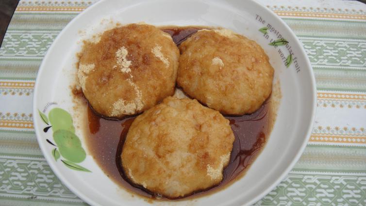 三大炮是成都著名的特色小吃,经验丰富的师傅把糯米团子抛出去时,会在三个小碟上弹过,如“弹丸”一样,发出“咚、咚、咚”的响声,滚到黄豆粉里~再淋上红糖酱,就是一份正宗的“三大炮”咯~