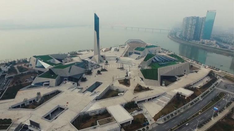 “三馆一厅”中的图书馆外景,“三馆一厅”是指包括长沙市博物馆、长沙市图书馆、长沙市规划展示馆、长沙市音乐厅及周边配套设施在内的长沙滨江文化园建筑群。
