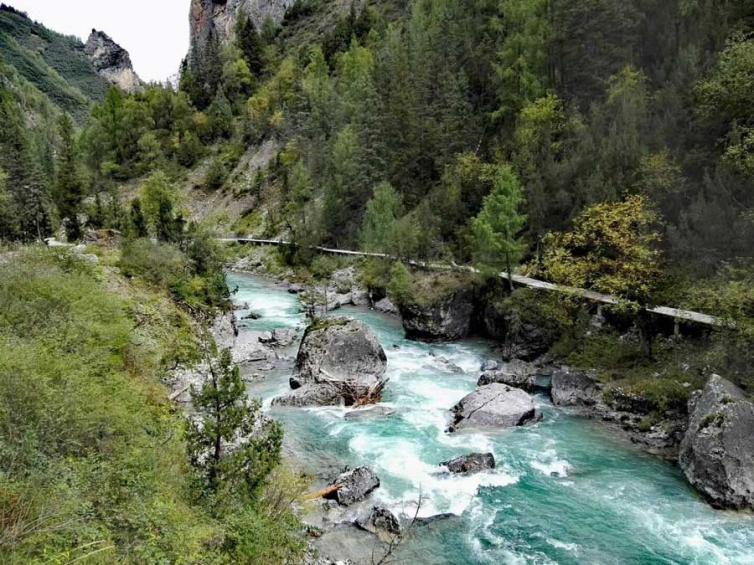 而其中更以阿角沟最为精华。当你沿着峡谷逆河流而行,转过一道山脚,横断在你面前的月亮门,佛一轮满月,洞内流出翡翠色的河流,令人惊叹。