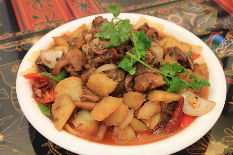 新疆大盘鸡是新疆地区名菜,吸收了西北多省的饮食方法和饮食习惯,是一个多地区、多民族的饮食文化结晶。大盘鸡是一个典型的多民族融合的菜谱,来源说法多种,真实的来源已无法考究,大约起源于80年代后期,主要用料为鸡块和土豆块,配皮带面烹饪而成。菜品色彩鲜艳,有爽滑麻辣的鸡肉和软糯甜润的土豆,辣中有香,粗中带细,而且经济实惠,亲朋聚会食用尚佳。鸡肉蛋白质的含量比例较高,种类多,而且消化率高。