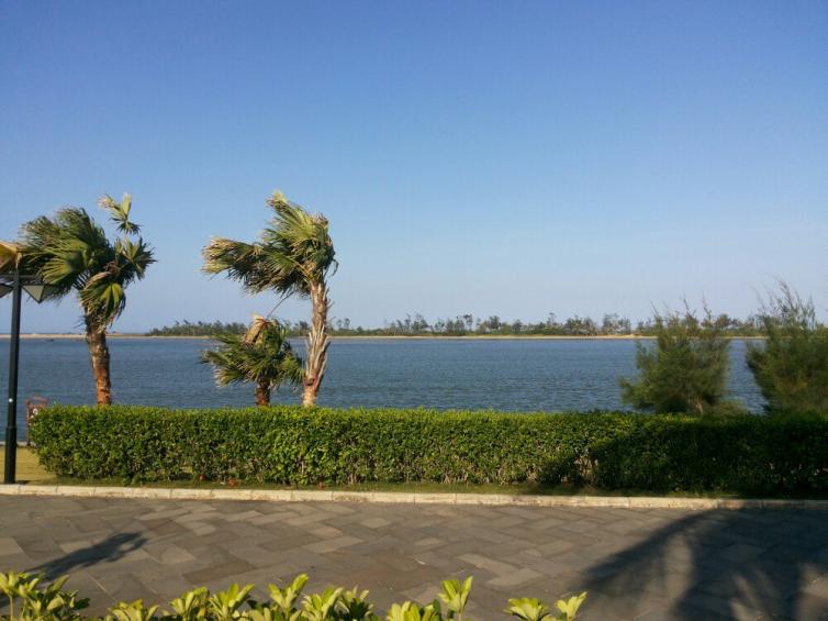 位于万泉河出海口的博鳌玉带湾被上海大世界吉尼斯总部以“分隔海、河最狭窄的沙滩半岛”列入吉尼斯之最,在亚洲仅此独有。随着路牌上指示万泉河漂流点的方向行使,距离起漂点14公里时会有一个三岔路口,右转前往起漂点,而我们要看的风景,还需一直行驶,直到看见博鳌锦江温泉大酒店,找个停车场,把车停下来后,沿着通外海边的小道前行,海阔天空的场景马上跃入眼帘。站在一大片金色的沙滩上,欣赏着海天一色的美景,不免感叹原来远眺玉带滩也别有一番风味。