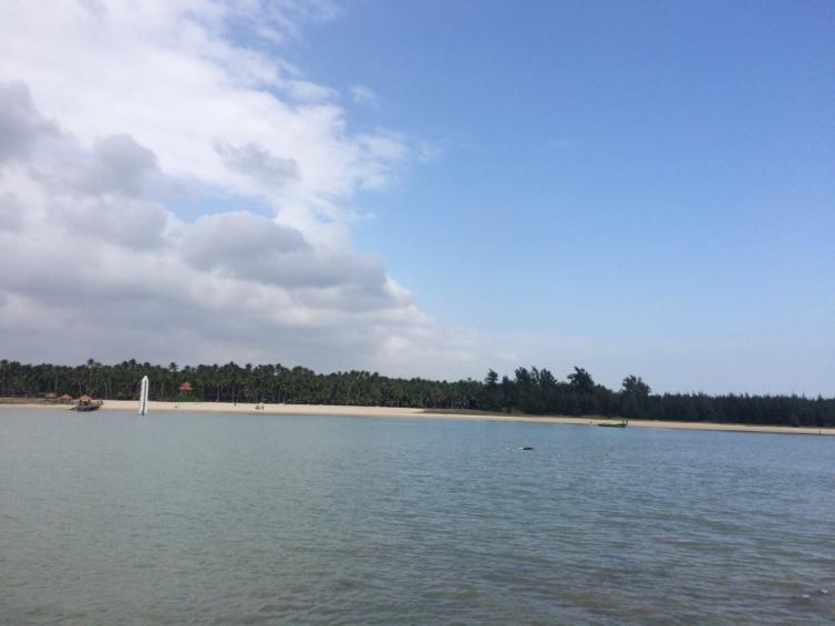 早晨,海上日出,红霞满天,波光粼粼,相映成趣;鸥群低翔,千帆迎日,景色美丽壮观;近岸水面,薄气缕缕,下水晨泳,清凉舒爽,泳后晨晒,身暖洋洋。太阳偏西,岸上椰林影覆水面,彤云缀空,凉风习习,海中晚浴,身爽心怡,疲劳消遁,醉迷忘归。