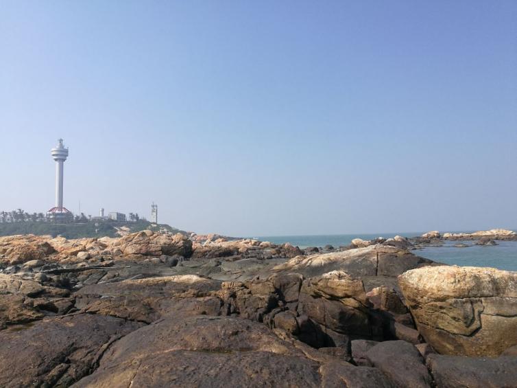 灯塔所在的山岭是花岗岩山体,岭下附近皆为巨石滩,银白色沙滩上散卧着光滑浑圆的巨石,奇形怪状,千姿百态。石头上还生长着绿藻,给石滩增添了点点生动的颜色。这里除了钓鱼者几乎没有游人,我走过石滩时成群的黑色大螃蟹仓惶逃窜,这种景象在三亚鹿回头和天涯海角等地的海边石滩绝对看不到。当然,我不是捕杀它们的吃货。