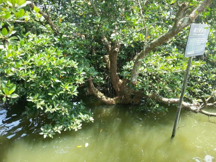 东寨港是个很大的内海,一条小河在演丰镇附近注入内海,宽阔的河口地带形成了红树林生长所需要的特殊环境,于是这片淡水、咸水交替淹没的河口就长着茂密的红树。