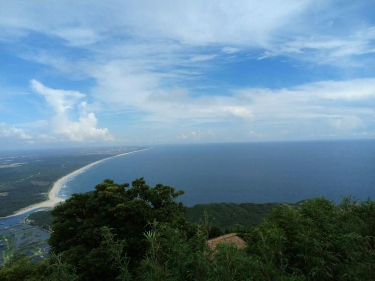 从停车场走一段小路上到山顶,可以登高望远,还有免费厕所。站在铜鼓岭上,山下绵长的月亮湾风光尽收眼底。从铜鼓岭下来直接去铜鼓角。铜鼓角是海南岛的最东角,也是一块突入海中的山岭。铜鼓角的北侧是大澳湾,南侧是石头公园。大澳湾是一处青山环抱的僻静海湾,水清沙软,只是有许多漂浮物被冲上沙滩。