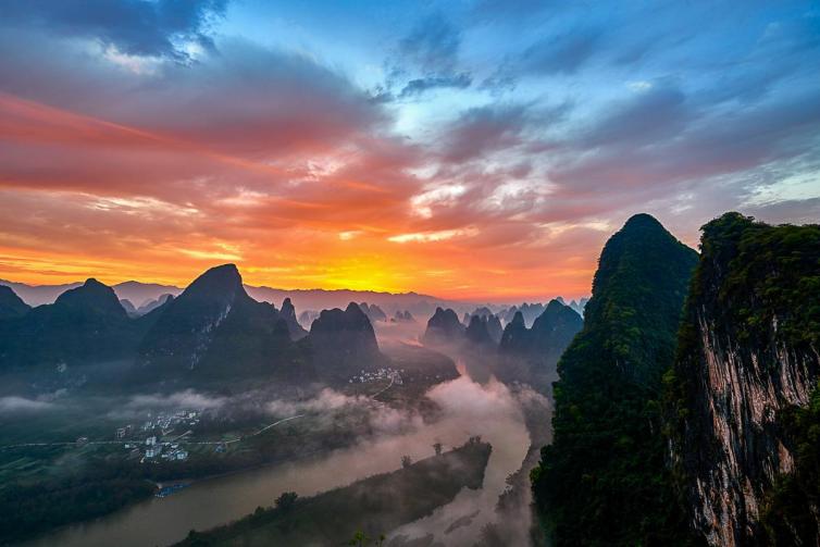 相公山日出,有山有水有竹筏是典型的桂林山水画,相公山位于阳朔县兴坪镇境内的漓江西岸,在黄布倒影和九马画山两景点之间。这里是俯瞰“漓江第一湾”的绝佳位置,登上相公山举目远眺,群峰排列有序,清澈的漓江蜿蜒流淌在群山怀抱中,景色十分壮美。这里的日出之景更是吸引了无数摄影家和摄影爱好者。相公山并不是很高,20分钟左右便可登上山顶,但因为位置较为偏僻,景色十分原生态,上山和下山的路程都较为陡峭,游玩途中一定要注意安全。下到山脚便可欣赏到九马画山的景色,从这里坐渡轮到江对岸,便可乘车前往兴坪古镇游玩。