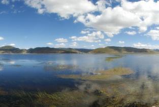 1.属都湖春夏季节百花盛开,湖畔四周一片片杜鹃花丛映红整个湖面,各种野花繁星似地贴着地面开放着。湖岸边,那绿色牧场炊烟袅袅,牛铃声声