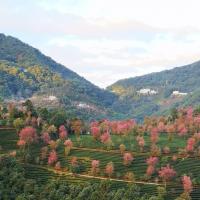 无量山樱花谷位于云南大理州南涧县,在无量山国家级自然保护区周边,与灵宝山国家森林公园相邻。每年12月中旬,全国大部分地方刚刚进入冬季。而南涧县的春天,却已经悄然来临了,无量山樱花谷的樱花都开了,绚烂的冬樱花争奇斗艳,摇曳生姿。粉红色的花,白色的云雾,绿色的茶园,构成彩云之南冬日里一道美丽的风景。
