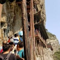 谁凿高山石、凌虚构梵宫’,悬空寺曾入选《时代周刊》世界十大不稳定建筑,也有称为‘世界十大最奇险建筑’之一。悬空寺因为有故事,更加令人向往。我们旅行团从五台山经颠簸崎岖的山路到达恒山悬空寺景区。老年人免门票,但登临悬空寺需要50元登临费(很有必要,限制了人数,否则人太多,悬空寺真悬了)。悬空寺呈“一院两楼”般布局。南北两座雄伟的三檐歇山顶高楼好似凌空相望,悬挂在刀劈般的悬崖峭壁上,三面的环廊合抱,六座殿阁相互交叉,栈道飞架,各个相连,高低错落。走在悬空寺有点摇摇晃晃的栈道上确实有步步惊心的感觉。