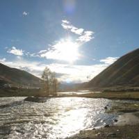 住在新都桥镇,路上的风景虽还不是深秋,没有层林尽染。不过还是极美极美的。接近夕阳的光辉照耀下,小河流水,藏族建筑,杨树构成一副最美的乡村画卷。