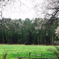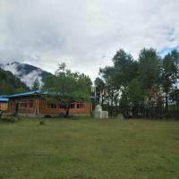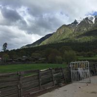进入岗乡自然保护区, 这里是云衫林区,有较多的客栈。这是因为岗乡有着一处光线美妙的地方,在索朗家庭旅馆的前面,道路的右边,一片绿色青稞田,几株粉红色的桃花树点缀其间,北面是雪峰
