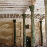 加满清真寺的礼拜室里,三十六根木柱子的雕刻和饰纹各不相同,据说是由三十六个穆斯林信徒捐赠的。拱顶的彩绘以花草为主,没有动物图案,它反映维吾尔人死后是不把动物带走的习俗和重视生命观念。