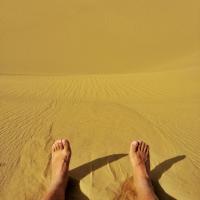 到达塔中时已经是晚上七点多,在旁边的川菜馆吃了饭,就急匆匆的拿着相机向塔克拉玛干沙漠深处跑去,已经迫不及待的欣赏沙漠日落了。 白天,沙漠的气温非常高,虽然太阳刚刚开始下落,但沙漠的地标气温还是非常高,赤脚踩在沙子上非常烫脚。 日落前的塔克拉玛干,金黄色的沙漠被一轮要消失的红日染成了红褐色。 走进死亡之海,根本什么也得不到。如果幸运的话,可能会遗失点什么。如果塔克拉玛干能够席卷走那点儿可怜的高贵之处。
