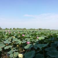 洪湖蓝田生态景区内有十里荷花带、万亩莲藕区、观荷长廊、九曲桥廊、观音座莲台、荷花仙子、钓鱼岛情人屋、湖心岛莲花源等十多处景点,多是与荷花有关。走在荷花丛中非常舒服,景色很美,就是太热了,洪湖赤卫队的表演让我不禁回到了战火纷飞的年代,很好!