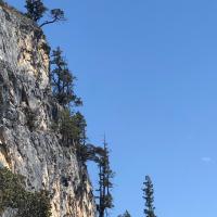 我们从通天峡景区乘车返回到巴拉格宗大峡谷入口出的服务中心。导游领着我们到附近一处峭壁前,说这是一颗有三千年树龄的菩提树。 以前也听说过释迦牟尼在菩提树下成佛,但印象中没有见过真正的菩提树。今天有幸一睹真容。这棵树除了离地面大约两米左右树干与石壁间有大约一尺距离外,两米以上枝叶都紧紧的趴在石壁上,所以,与其说这是一颗树,还不如说这是一颗“藤曼”植物。