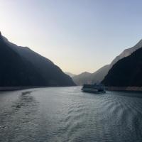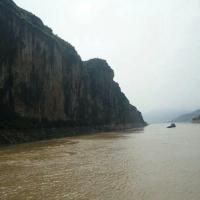 早上登船继续上行游览瞿塘峡(长度最短、最险峻),通过峡口“夔门”(天下雄)景点,只见两边高大垂直的山体岩壁临江夹峙,犹如一道大闸门立于江面,的确非常挺拔雄伟。