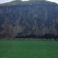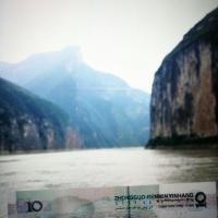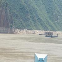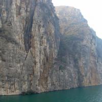 我们的游船慢慢逼近了瞿塘峡,我是看着手机上的导航知道接近瞿塘峡了。瞿塘峡是三峡中最上游的一段,也是最短的,只有8公里长,但它有号称“天下雄”的夔门,是十元人民币的背景,自然是十分壮观的。听说三峡截流以后,水位上涨很多,很多古迹都被淹在水下了,夔门的景观因为水位上涨,已经远不如以前威武雄壮了,非常遗憾。