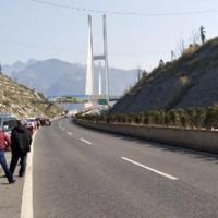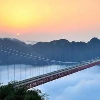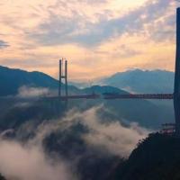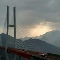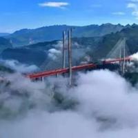 北盘江大桥礼赞北盘江上公路桥,五百六十五米高,横跨一千三百米,世界最高斜拉桥。横观绝壑铺天路,顺看险峰通大道,远眺彩虹跨深谷,仰望铁龙穿云霄。