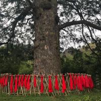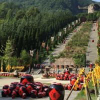 神农祭坛青山环抱,千年古树矗立其中,美丽而幽静的神农祭坛空气清新,山顶云卷云舒。体验者踏上令人莫名沉重的243步台阶,广场上无数的大酒坛子、缠绕着无数红色绸缎的千年古杉、挂满无数黄色绸缎的古树、象征着金木水火土五种颜色的地坛……神农氏散发的威严一览无遗! 体验者祭拜炎帝后,将承载新年美好祝福的纸条挂在亭子上,虔诚地敲响木钟,听着悠扬深远的钟声响彻神农谷,回荡在天际,内心美好的愿景好像变得更加清晰。